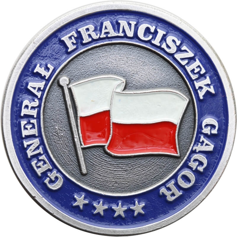 Emaliowana flaga RP na teksturowanym tle. W niebieskim otoku napis: GENERAŁ FRANCISZEK GĄGOR oraz cztery gwiazdki generalskie. -