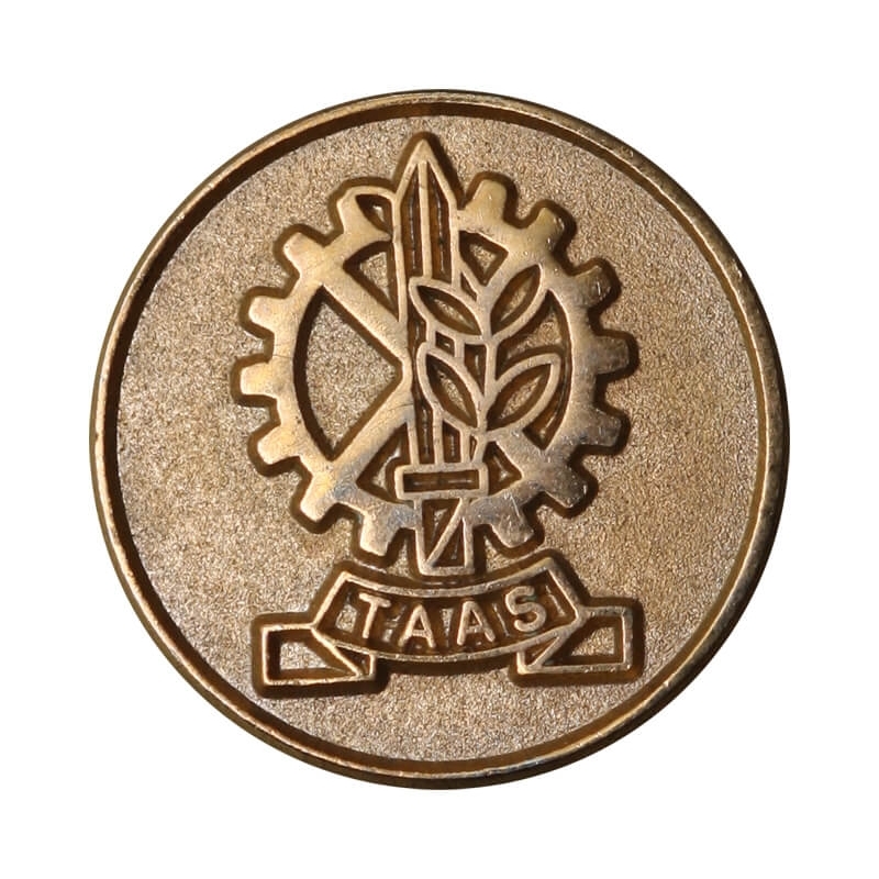 Awers: Centralnie umieszczony logotyp korporacyjny TAAS wpisany w zarys koła zębatego. Symbolika łączy elementy przemysłowe (koło zębate) z motywami obronnymi i narodowymi: wewnątrz znajduje się miecz opleciony gałązką oliwną (symbol IDF – Sił Obronnych Izraela). W dolnej części umieszczona wstęga z akronimem TAAS.