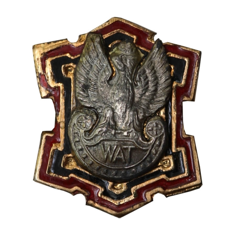 Opis przedmiotu: Wysokiej klasy miniaturka odznaki absolwenta Wojskowej Akademii Technicznej (WAT) w Warszawie. Egzemplarz wykonany z metalu, srebrzony i złocony, z nałożoną emalią termiczną w barwach bordowo-czarnych. Przedmiot przedstawia orła w koronie na tarczy amazonek (wzór III RP). Mocowanie typu butterfly. Stan zachowania oceniam jako idealny (gabinetowy) – emalia bez odprysków, powłoka galwaniczna bez przetarć.