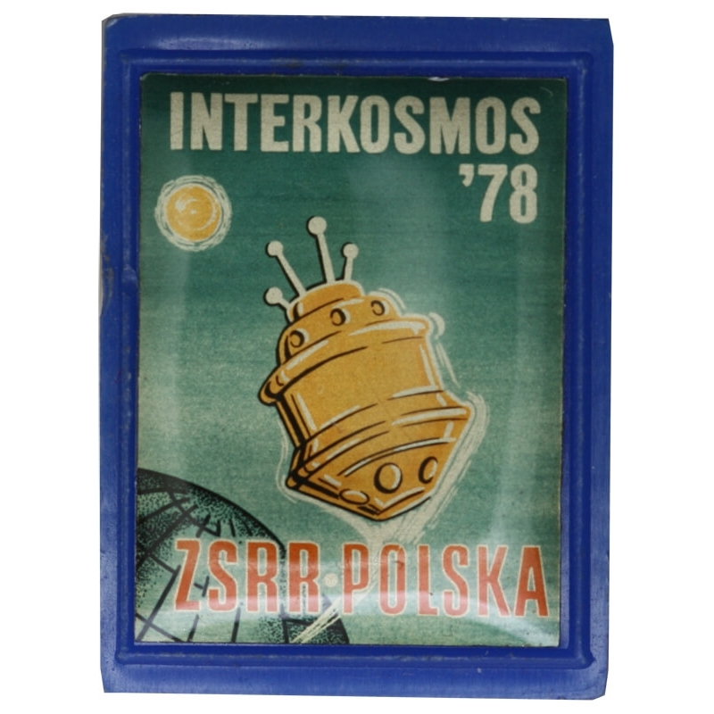 Kolekcjonerska plakietka/wpinka upamiętniająca lot pierwszego polskiego kosmonauty (Mirosława Hermaszewskiego) w ramach programu INTERKOSMOS '78. Grafika przedstawia lądownik Sojuz na tle Ziemi i napisy: INTERKOSMOS '78 oraz ZSRR-POLSKA.