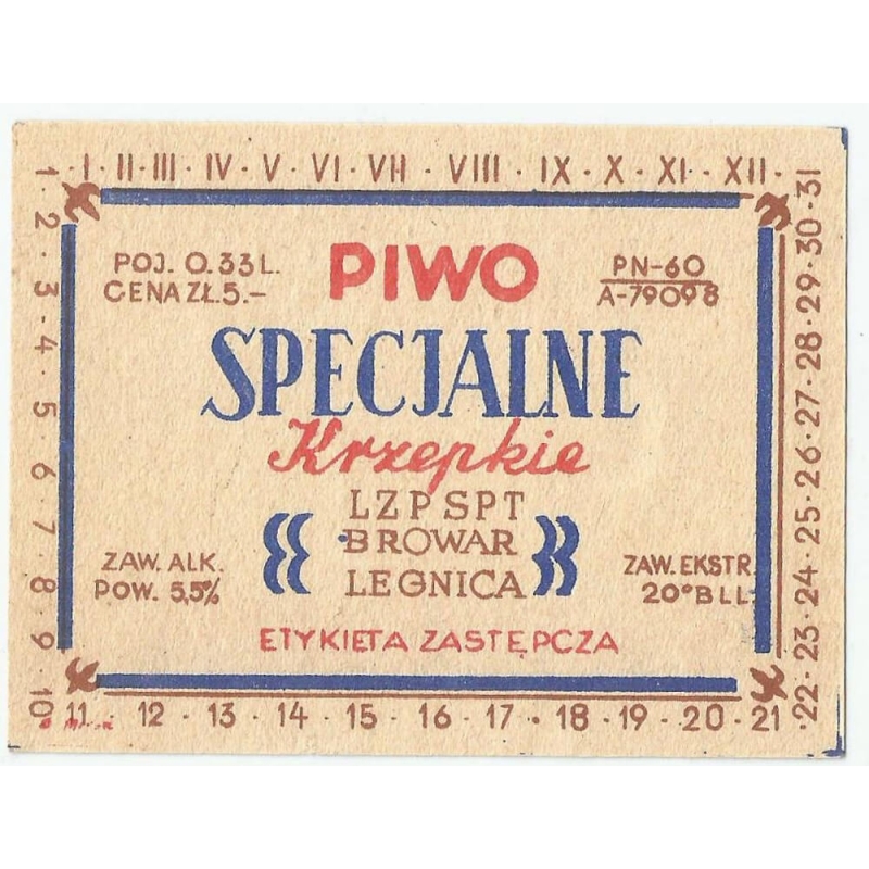 Oryginalna, papierowa etykieta zastępcza z okresu PRL do piwa „Specjalne Krzepkie” produkowanego przez Browar Legnica (LZPSPT). Na etykiecie podano m.in. pojemność 0,33 l, zawartość alkoholu 5,5% oraz ekstrakt 20° Blg.