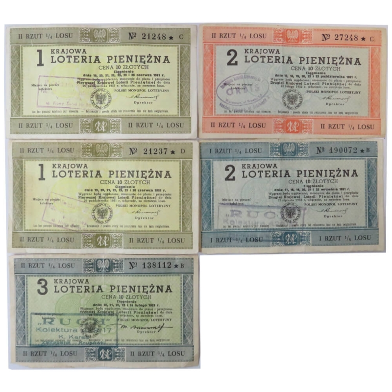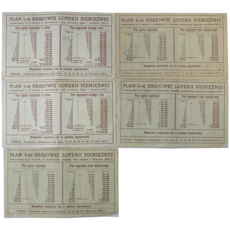 Zestaw oryginalnych losów Krajowej Loterii Pieniężnej, organizowanej przez Polski Monopol Loteryjny na początku lat 50. XX wieku. Oferowany komplet obejmuje losy z 1., 2. oraz 3. Krajowej Loterii Pieniężnej, wraz z zachowanymi planami wygranych (rewersy).
