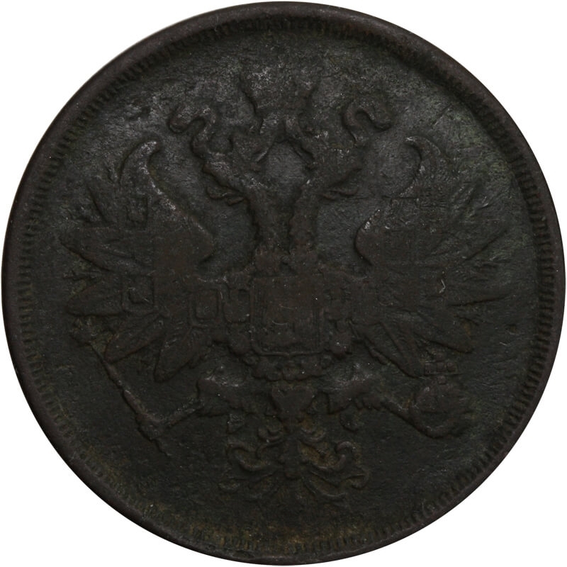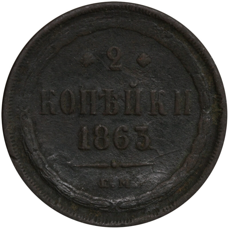Miedziana moneta o nominale 2 kopiejek wybita w 1863 roku, za panowania cara Aleksandra II. Jest to klasyczny przykład rosyjskiego bicia miedzianego z okresu wielkich reform imperium.