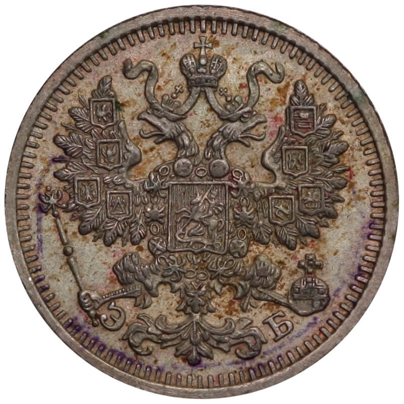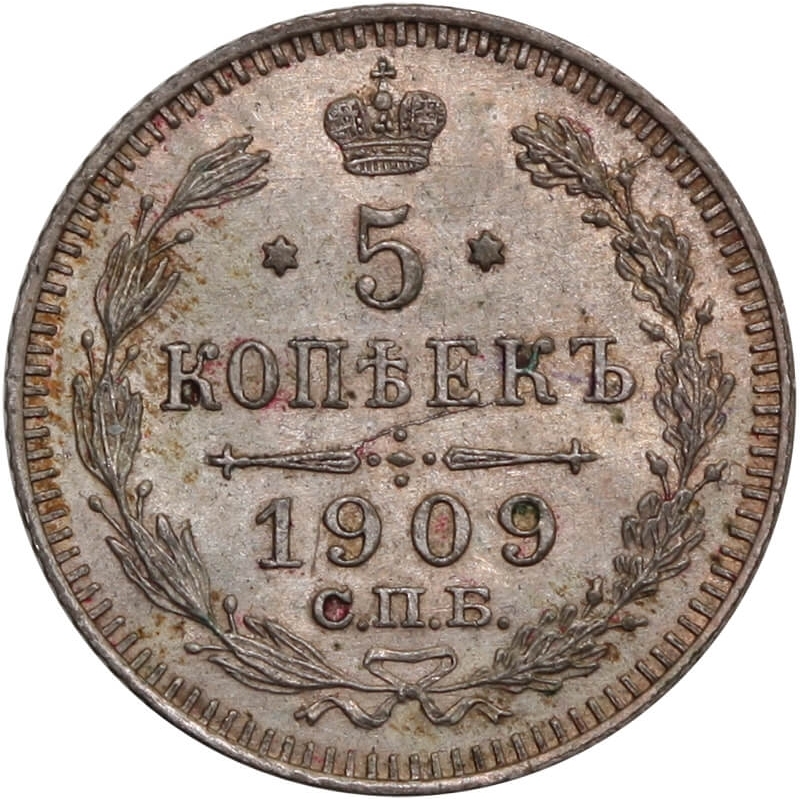 Oryginalna moneta obiegowa Imperium Rosyjskiego z 1909 roku, nominał 5 kopiejek, mennica СПБ (Petersburg). Na awersie nominał „5 КОПѢЕКЪ”, data 1909 oraz wieniec roślinny pod koroną. Na rewersie dwugłowy orzeł cesarski z tarczami herbowymi, berłem i jabłkiem.