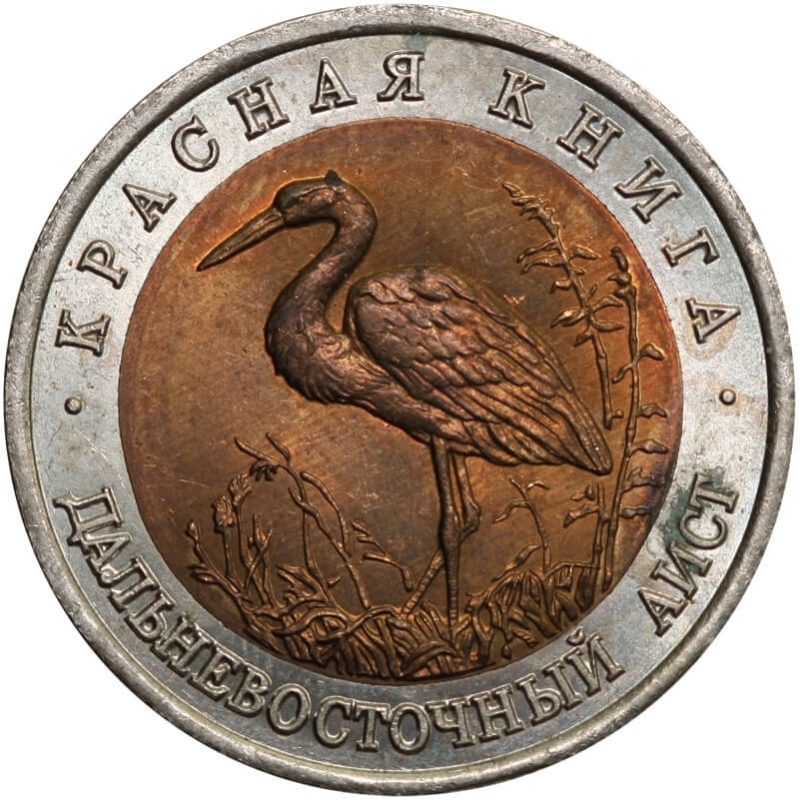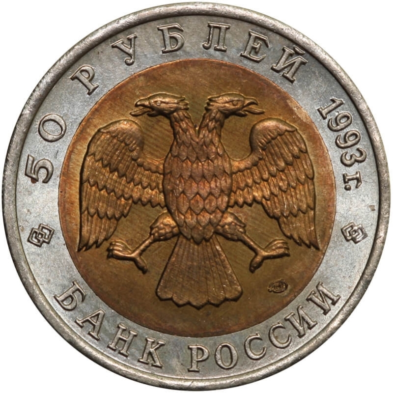 Bimetaliczna moneta o nominale 50 rubli z 1993 roku. Egzemplarz pochodzi z serii „Czerwona Księga” – cyklu poświęconego gatunkom zwierząt zagrożonych wyginięciem.
