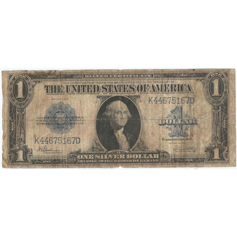 Wydany w 1923 roku, mógł być wówczas wymieniony w banku na równowartość jednego dolara w srebrze. Na awersie widnieje portret George’a Washingtona, pierwszego prezydenta USA, a na rewersie ozdobny, symetryczny nadruk w kolorze zielonym z dużym napisem “ONE DOLLAR”. Była to ostatnia emisja dużego formatu („Large Size”), zanim w 1928 roku wprowadzono obecny, mniejszy rozmiar banknotów. Egzemplarze z tej serii są dziś cenione przez kolekcjonerów jako świadectwo przejściowego okresu amerykańskiego systemu walutowego, kiedy dolar miał jeszcze bezpośrednie powiązanie z metalem szlachetnym.