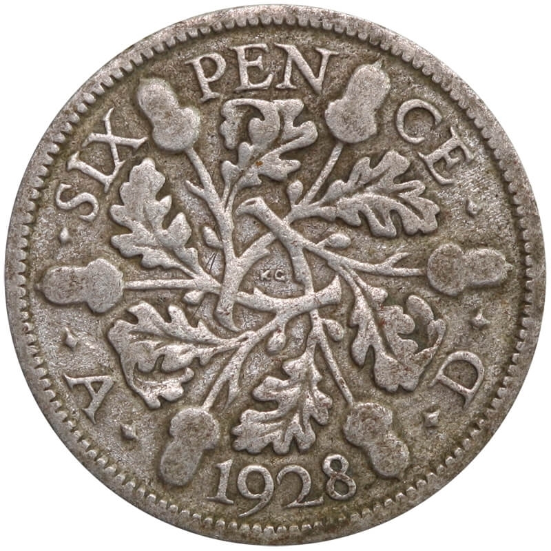 Rewers: Sześć liści dębu złączonych w formie wieńca z sześcioma żołędziami. Nad grafiką napis SIXPENCE, u dołu rok 1928. W centrum widoczne małe litery KG – inicjały projektanta (Kruger Gray).