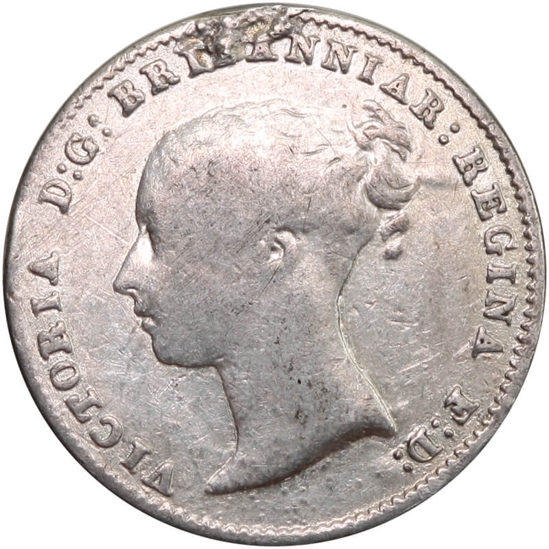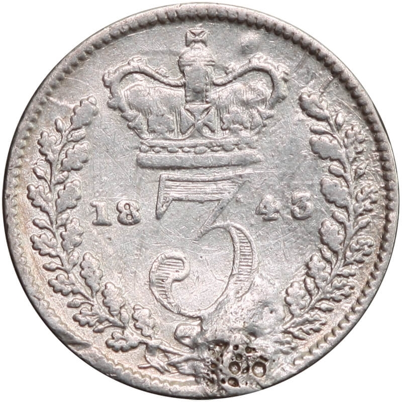Srebrna moneta o nominale 3 pensów z wczesnego okresu panowania królowej Wiktorii. Egzemplarz ten pochodzi z roku 1843 i przedstawia tzw. „Young Head” (młodą głowę) monarchini, projekt autorstwa legendarnego Williama Wyona.
