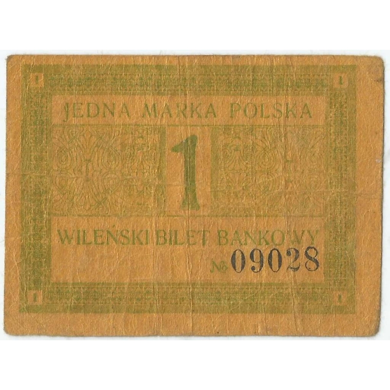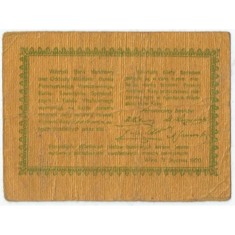 Wileński bilet bankowy o nominale 1 marki polskiej, emitowany w 1920 r. przez Wileński Bank Handlowy i Oddziały Banku Przemysłowego oraz instytucje spółdzielcze. Awers z dużym nominałem i numeracją, rewers z pełnym tekstem gwarancyjnym oraz podpisami przedstawicieli banku. Egzemplarz w stanie obiegowym: liczne zgięcia, wytarcia i naturalne ślady użytkowania, lecz papier w całości i czytelny nadruk. Klasyczny bon kryzysowy okresu przejściowego na Wileńszczyźnie.