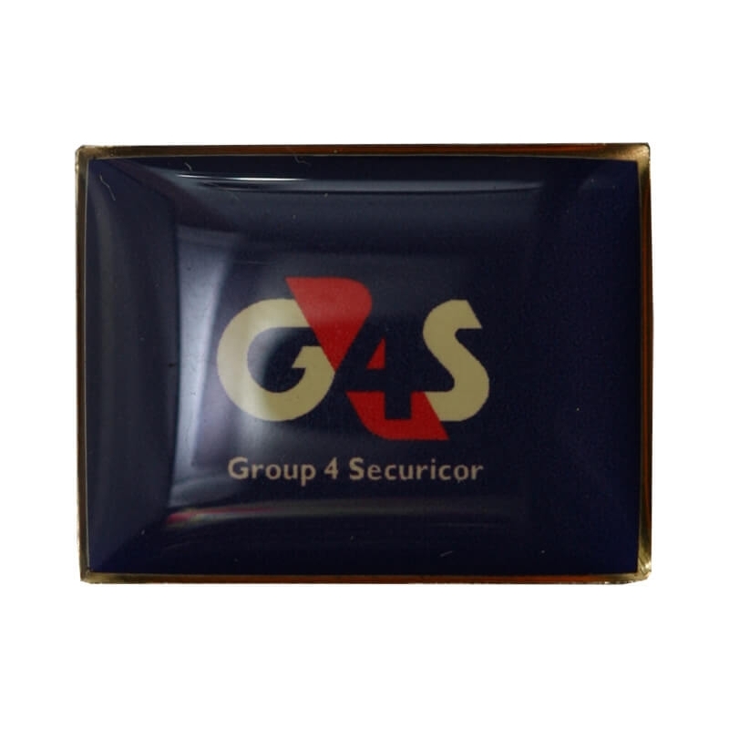 Metalowa, prostokątna wpinka korporacyjna światowego lidera w branży ochrony i bezpieczeństwa – firmy G4S (Group 4 Securicor). Przedmiot wykonany w kolorze złotym, z logotypem zatopionym pod warstwą przezroczystej emalii.