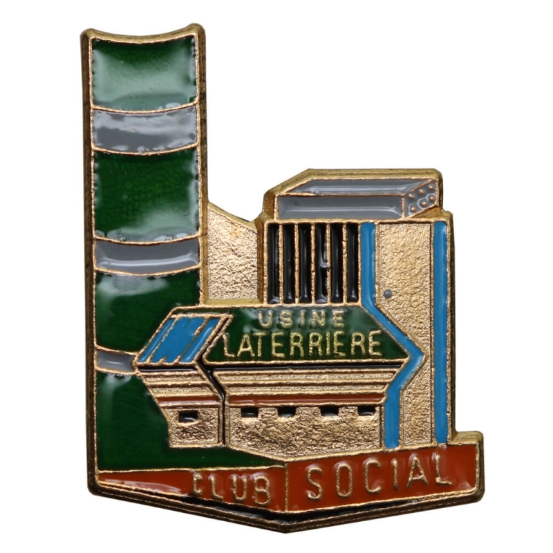 Emaliowana wpinka pamiątkowa należąca do członka Club Social działającego przy zakładzie produkcyjnym Usine Laterrière. Przedmiot wykonany z metalu w kolorze złotym, z wielobarwną emalią przedstawiającą sylwetkę nowoczesnej (na czas powstania) fabryki z charakterystycznym wysokim kominem.