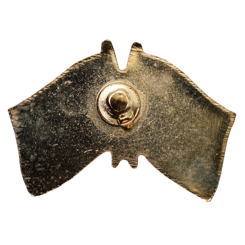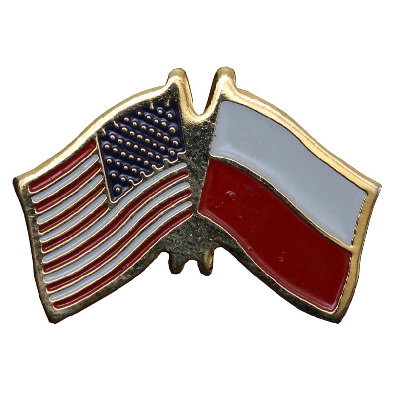 Metalowa wpinka (pin) emaliowana, przedstawiająca skrzyżowane i powiewające flagi Stanów Zjednoczonych Ameryki oraz Rzeczypospolitej Polskiej. Przedmiot stanowi osobistą pamiątkę po polskim generale.
