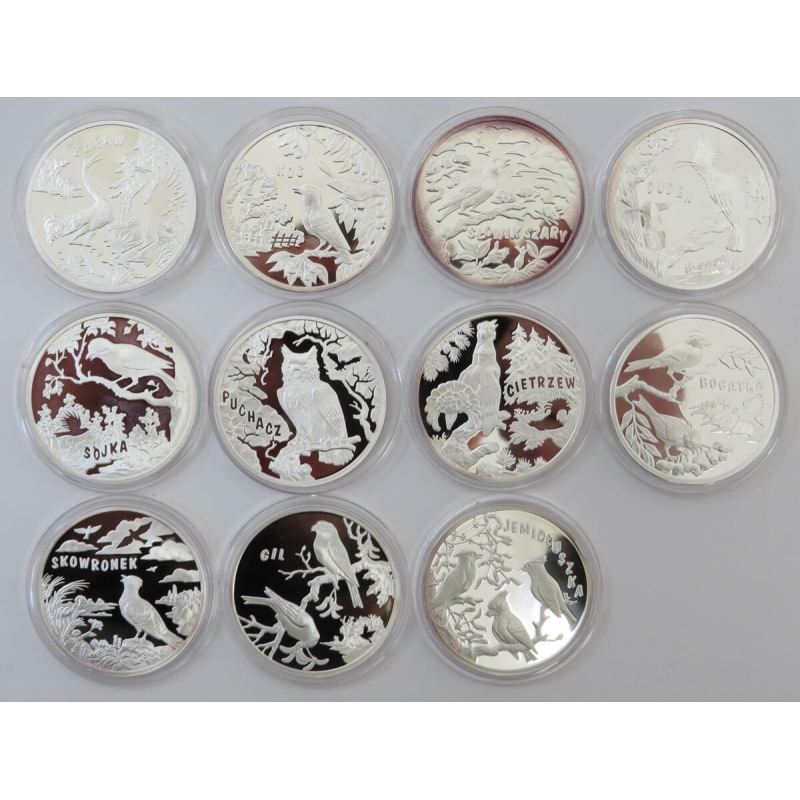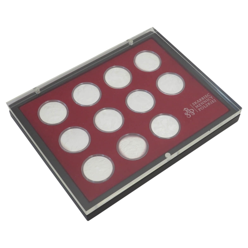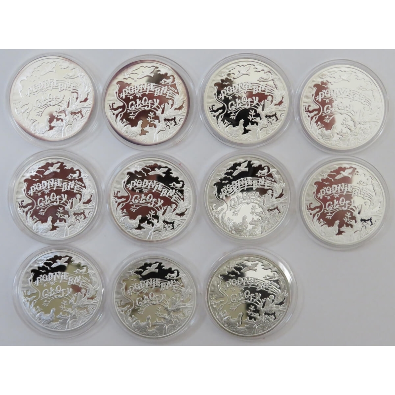 Piękny zestaw numizmatów 11 z Kolekcji PODNIEBNE GŁOSY zapakowany w eleganckie oryginalne pudełko (delikatne ślady używania).