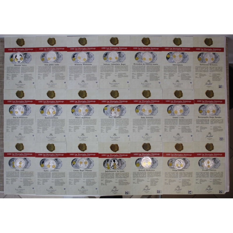 Zestaw kolekcjonerski „1000 lat Pieniądza Polskiego” to unikalna seria 21 numizmatów upamiętniających najważniejsze momenty w historii polskiego pieniądza. Każdy medal został wykonany miedzi platerowanej srebrem i złotem próby 999. Komplet zawiera pełną dokumentację – oryginalne certyfikaty autentyczności z opisem każdego numizmatu.
