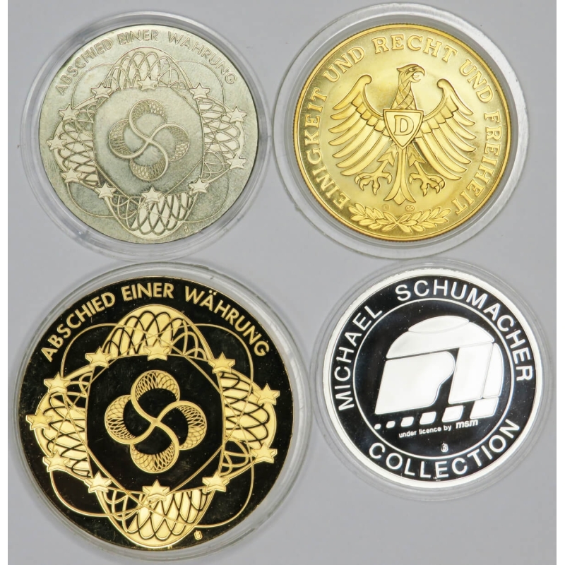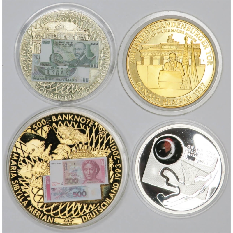 Zestaw czterech medali kolekcjonerskich w kapslach, w tym emisje tematyczne z serii: banknoty europejskie (100 Schillingów, 500 DM), medal „200 Jahre Brandenburger Tor – Ronald Reagan 1987” oraz medal z kolekcji Michael Schumacher Collection. Medale w efektownych wykończeniach (złocenie, srebrzenie, kolorowe wstawki), zachowane w bardzo dobrym stanie, idealne do uzupełnienia kolekcji tematycznej. Sprzedaż dotyczy kompletu widocznego na zdjęciach.