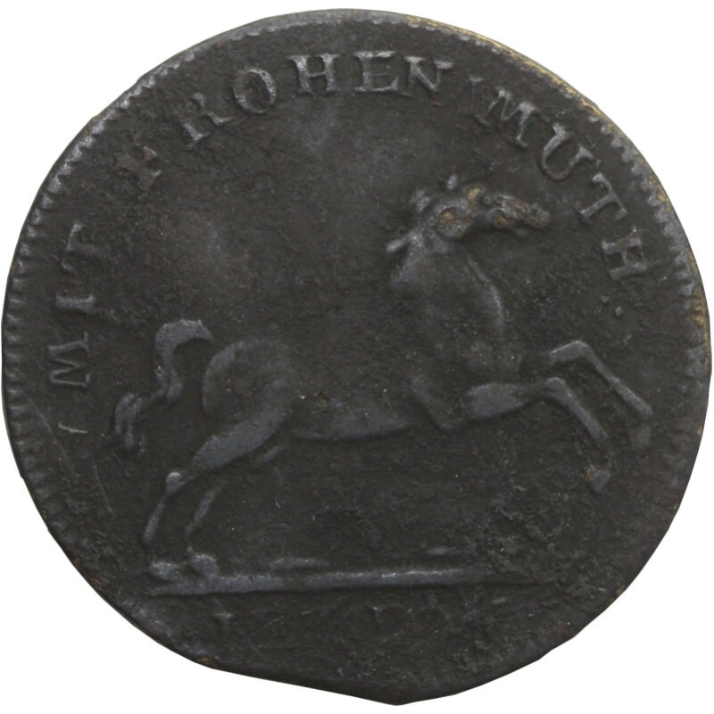 Mosiężny żeton liczebny (rechenpfennig) pochodzący z XIX wieku, produkcji norymberskiej, przypisywany wytwórni L. Chr. Lauer. Awers: popiersie cesarza Rosji Mikołaja I Romanowa w lewo, legenda w otoku NIKOLAUS KAIS VON RUSSLAND (w wariancie skróconym). Rewers: koń w galopie, pod nim linia odcinka, w otoku motto MIT FROHEN MUTH, u dołu napis IETTON. Waga 3,6g